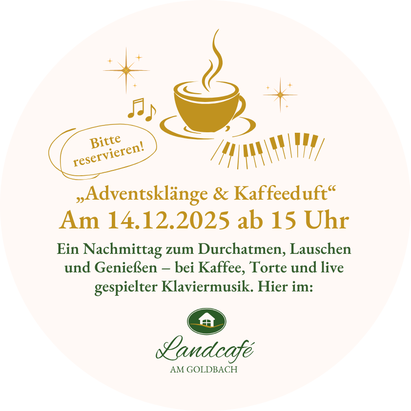 Ob ein Frühstück, Hochzeitsfeiern oder Kommunionsfeier, wir decken für Sie für jede Personenanzahl im Landcafé am Goldbach ein. Ab ca. 35 bis maximal 50 Personen können Sie bei uns als geschlossene Gesellschaft feiern. Kommen Sie zur individuellen Planung auf uns zu, damit ein schönes Fest gelingen kann. Unser Frühstück servieren wir samstags und sonntagmorgens, unsere Torten ab Mittwochmittag. Für warme Speisen kooperieren wir mit Carsten Dierker vom Restaurant „Zum Forellental“.